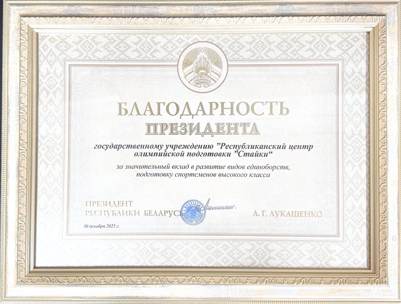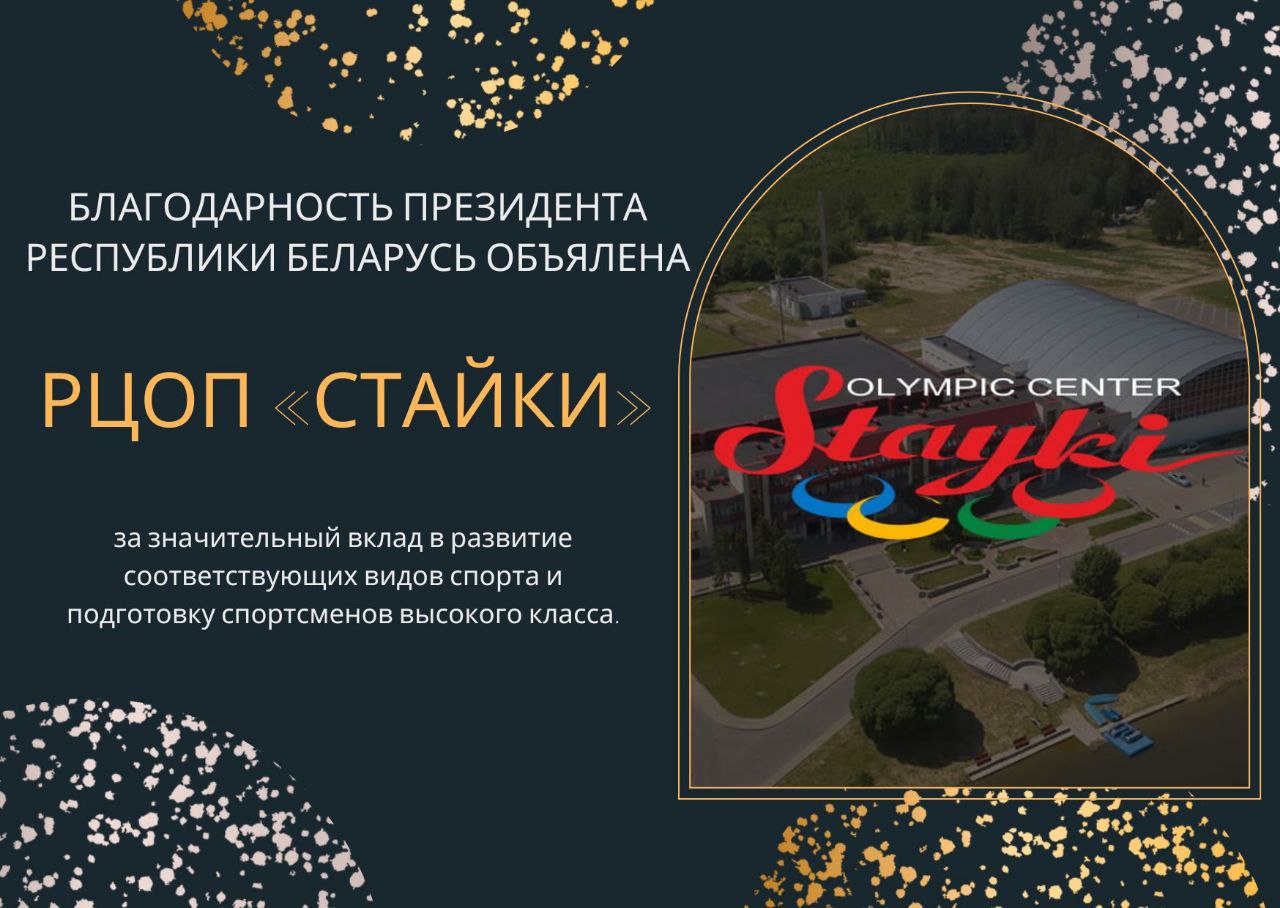 С гордостью сообщаем, что государственное учреждение РЦОП «Стайки» получило благодарность Президента Республики Беларусь за значительный вклад в развитие соответствующих видов спорта и подготовку спортсменов высокого класса!