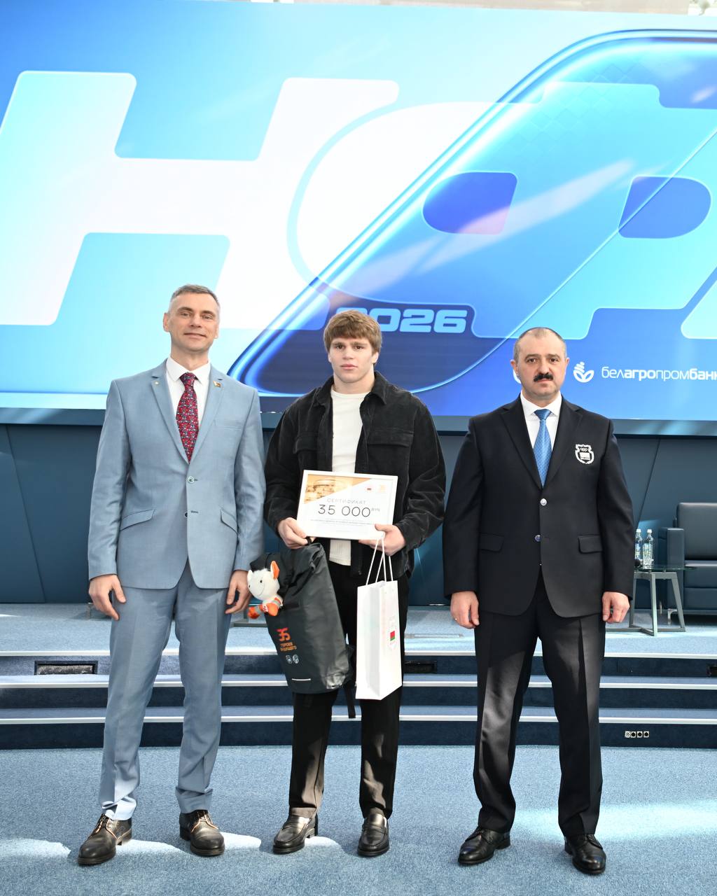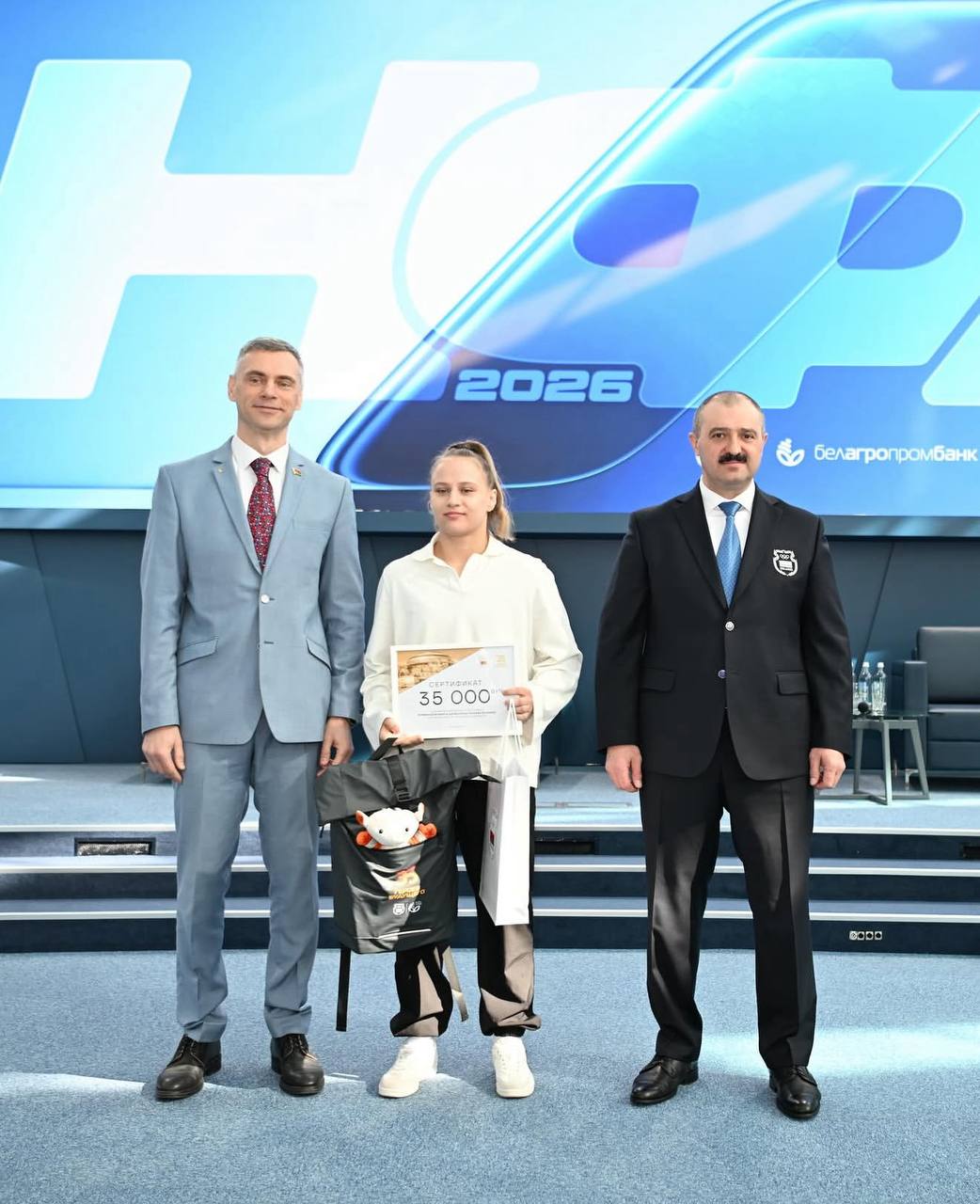 На форуме глава НОК Виктор Лукашенко и заместитель председателя правления Белагропромбанка Сергей Чугай вручили денежные сертификаты и подарки лауреатам нового проекта финансовой поддержки перспективных спортсменов, приуроченного к 35-летию НОК Беларуси, – «35 Героев будущего».