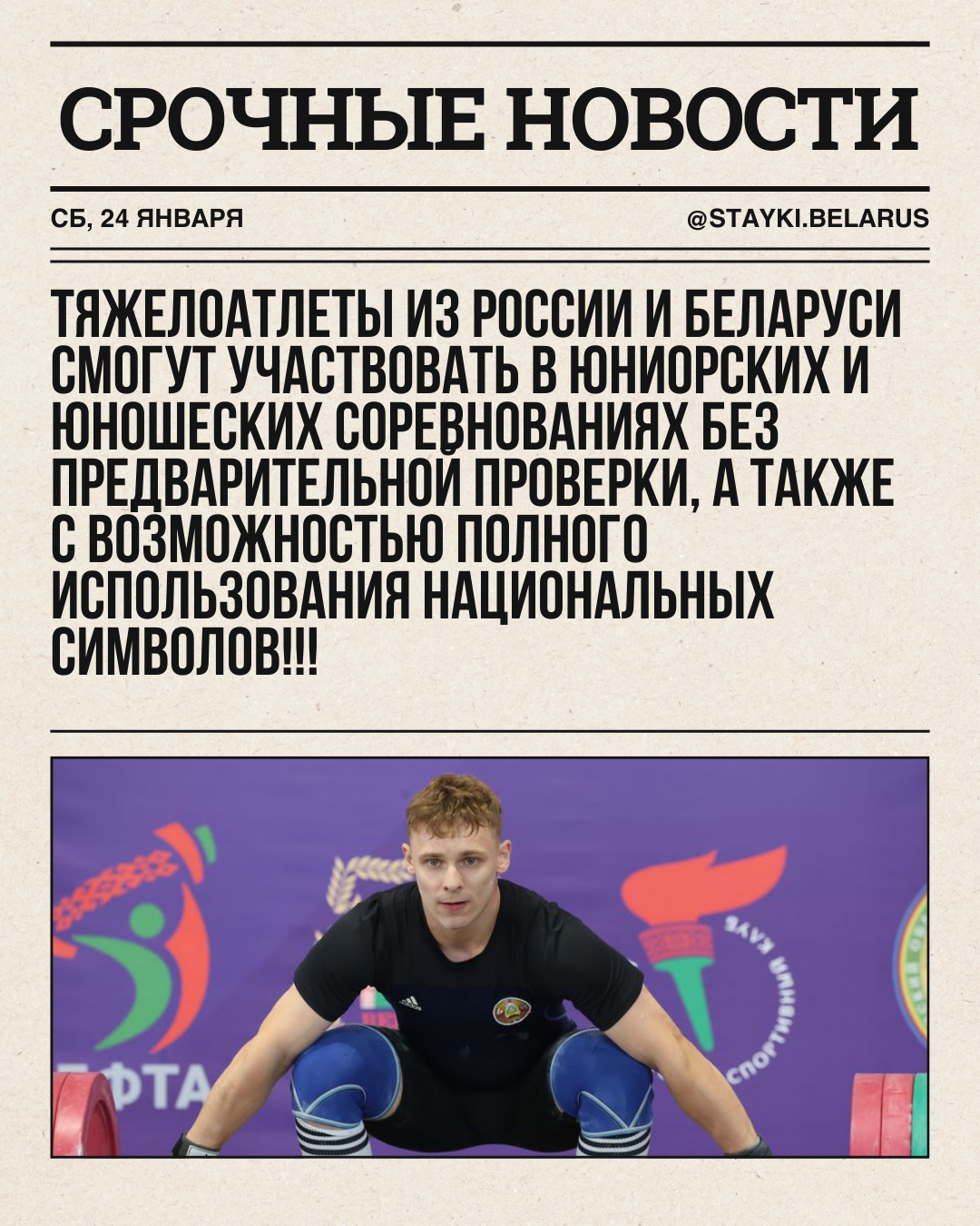 ✅ Исполнительный комитет Международной федерации тяжёлой атлетики (IWF) принял важное решение, которое откроет новые возможности для спортсменов из России и Беларуси. Теперь они смогут участвовать в юниорских и юношеских соревнованиях без предварительной проверки, а также с возможностью полного использования национальных символов.
