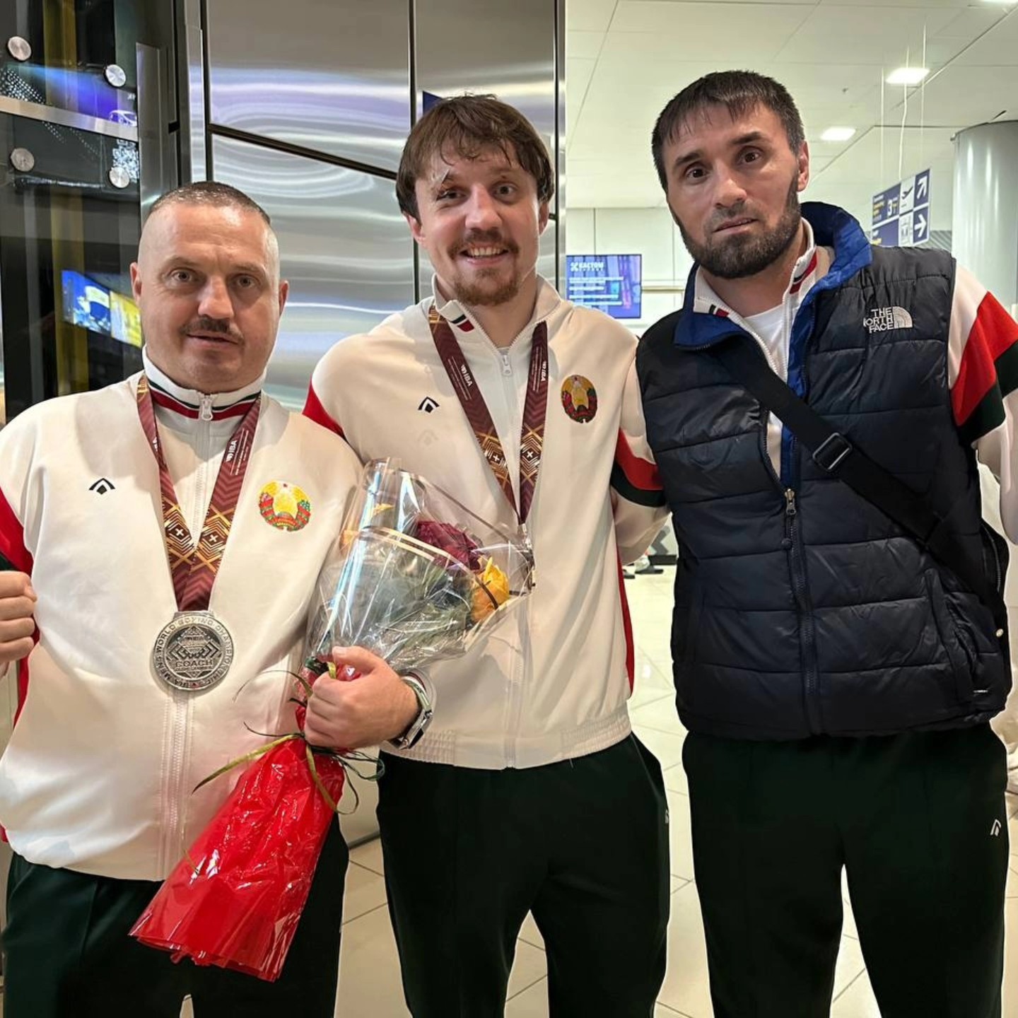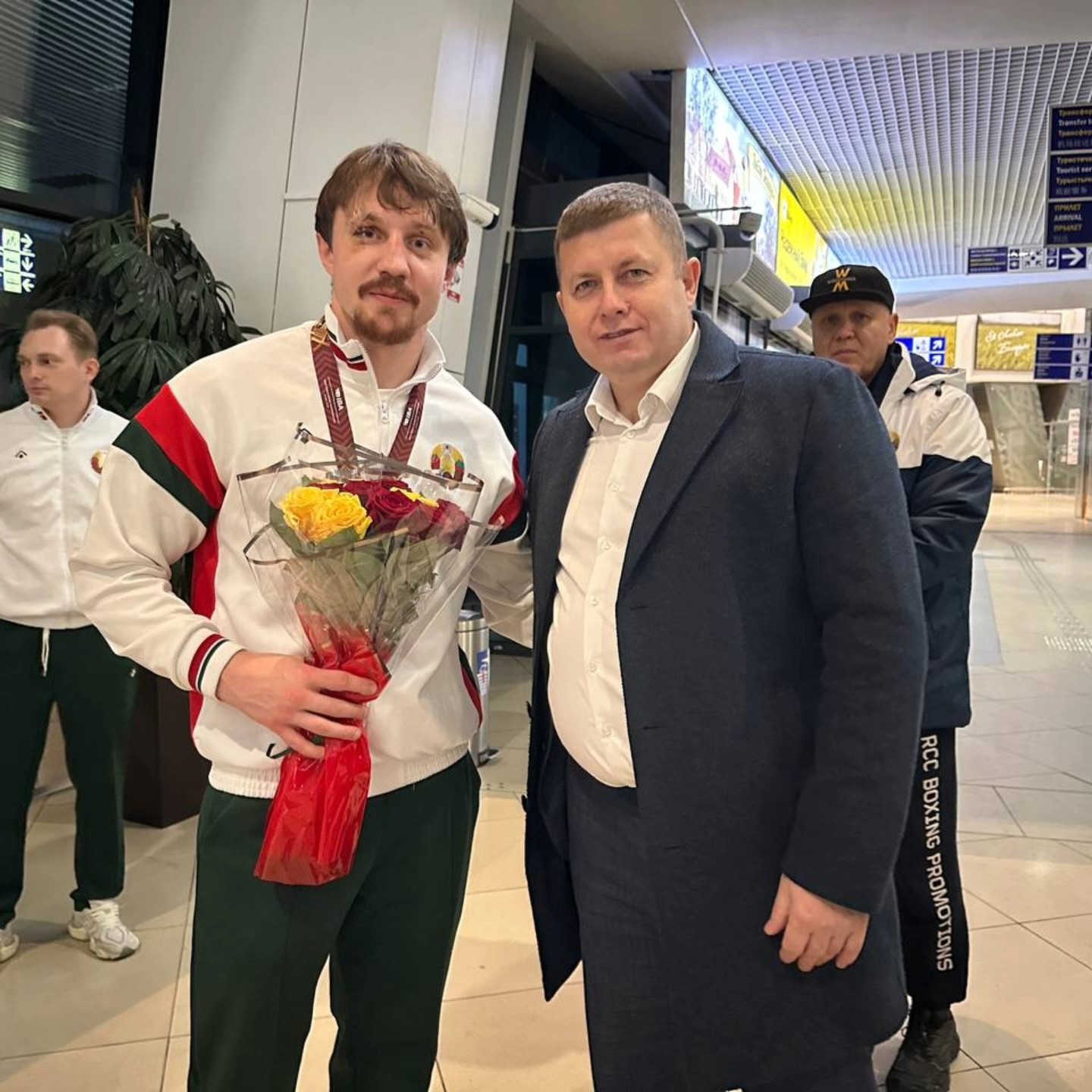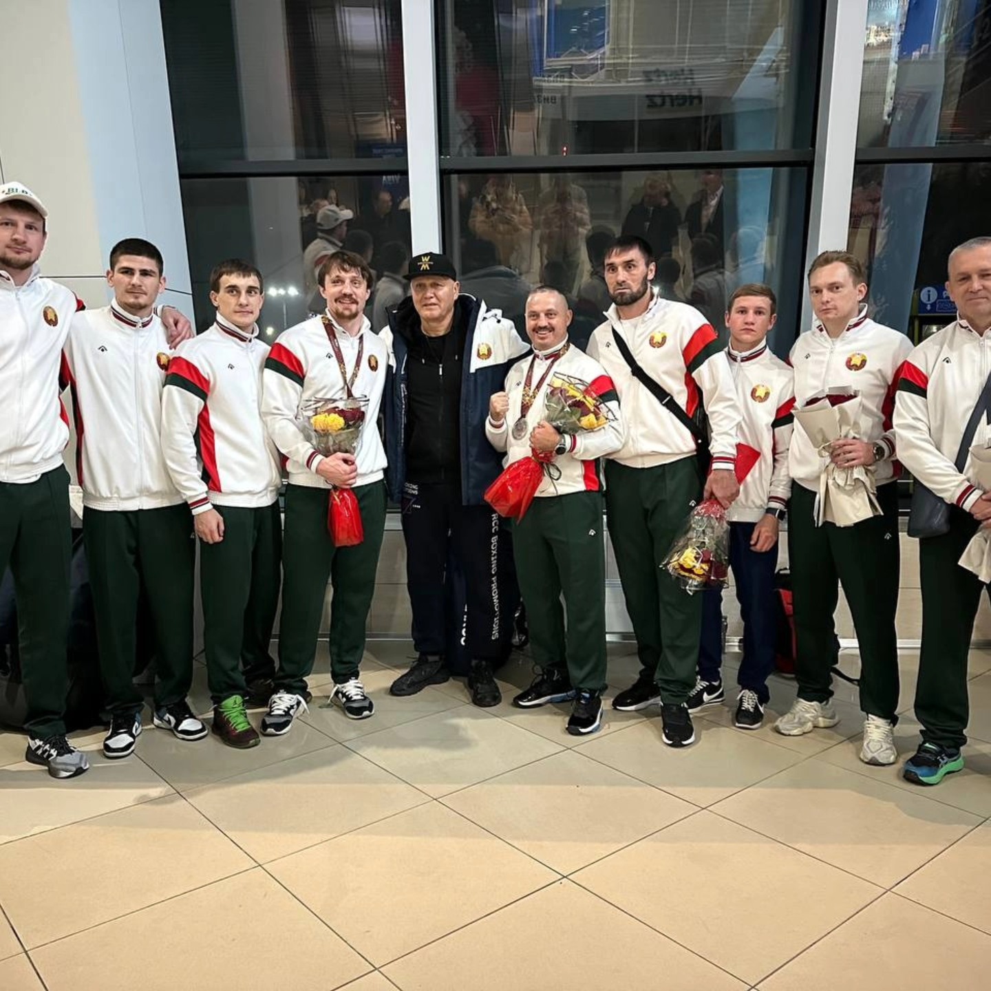 Сегодня ночью в национальном аэропорте «Минск» руководство государственного учреждения «РЦОП «Стайки» во главе с генеральным директором Хмельковым Сергеем Васильевичем совместно с руководством НК РБ по боксу и руководством ОО «БФБ» торжественно встретили национальную команду Республики Беларусь по боксу с чемпионата мира среди мужчин, который проходил в период с 30 ноября по 13 декабря 2025 года в г.Дубай (Объединенные Арабские Эмираты).